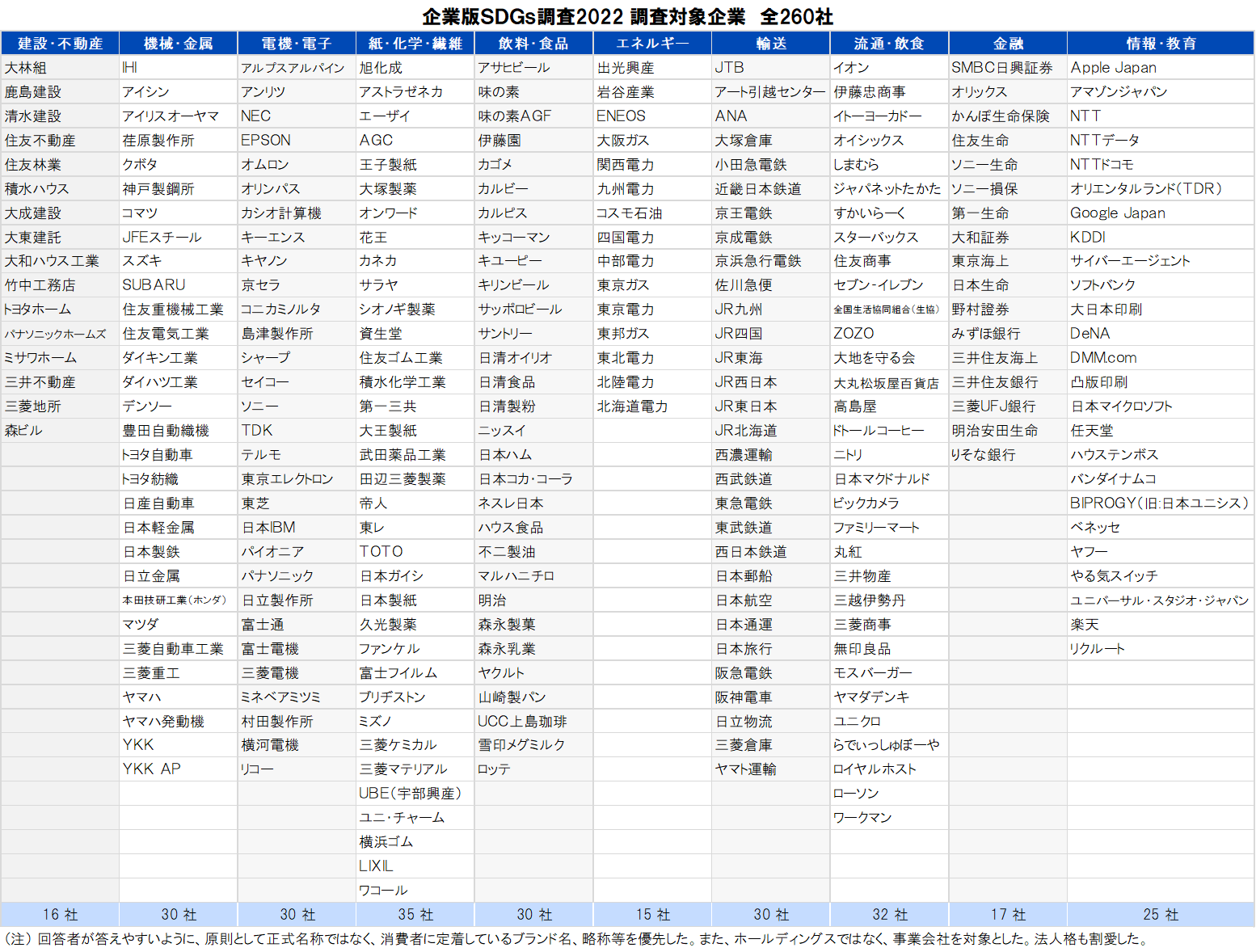 全260社のうち、【飲料・食品】業種グループは以下の通り