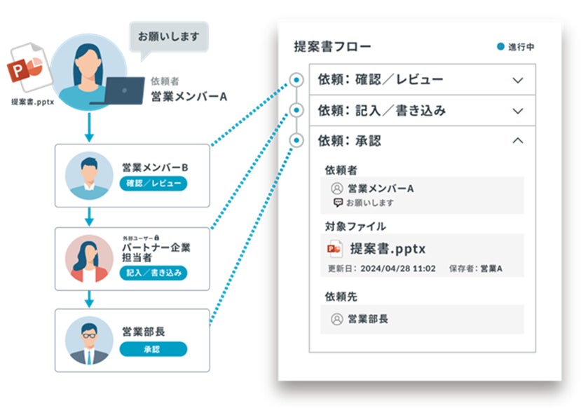 TaskFlow™は、メールやチャット、ファイル転送ツールなど、従来のコミュニケーションツールにファイルを散在・散逸させず、Fileforce上で保存したファイルやドキュメントに関わる「申請・承認」「確認・レビュー」「記入・校了」「回覧」など、日常の業務において発生する様々な依頼や指示などのタスクを、その場で簡単にワークフローに乗せることができます。