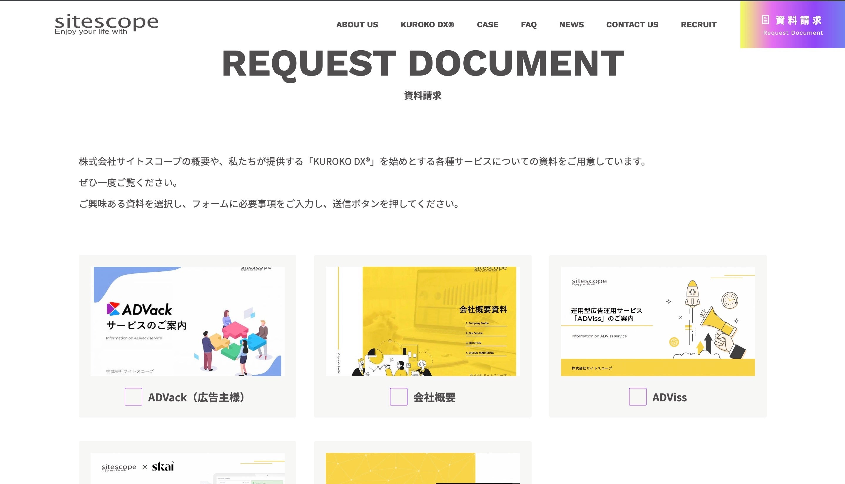 会社概要をはじめ、サイトスコープが提供する「KUROKO DX®︎」、「ADVack」、「ADViss」、「Skai(旧Kenshoo」)、「ADVell」、「システム開発ソリューション」のサービス資料がダウンロードできます。