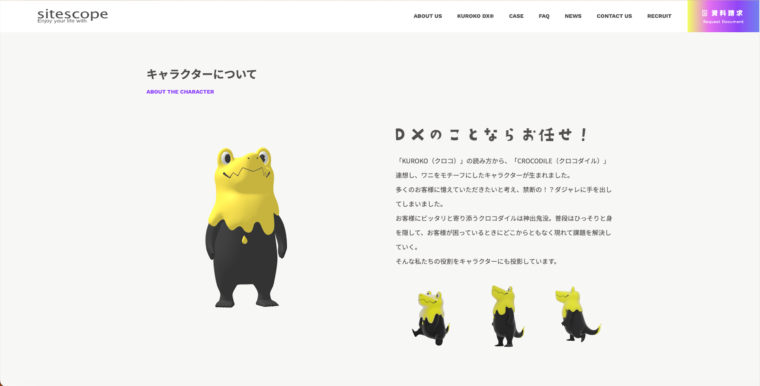 「KUROKO DX®︎」のイメージキャラクターである「クロコくん」が移り行くシーンの中、DXの道を歩いていくTOPページ。