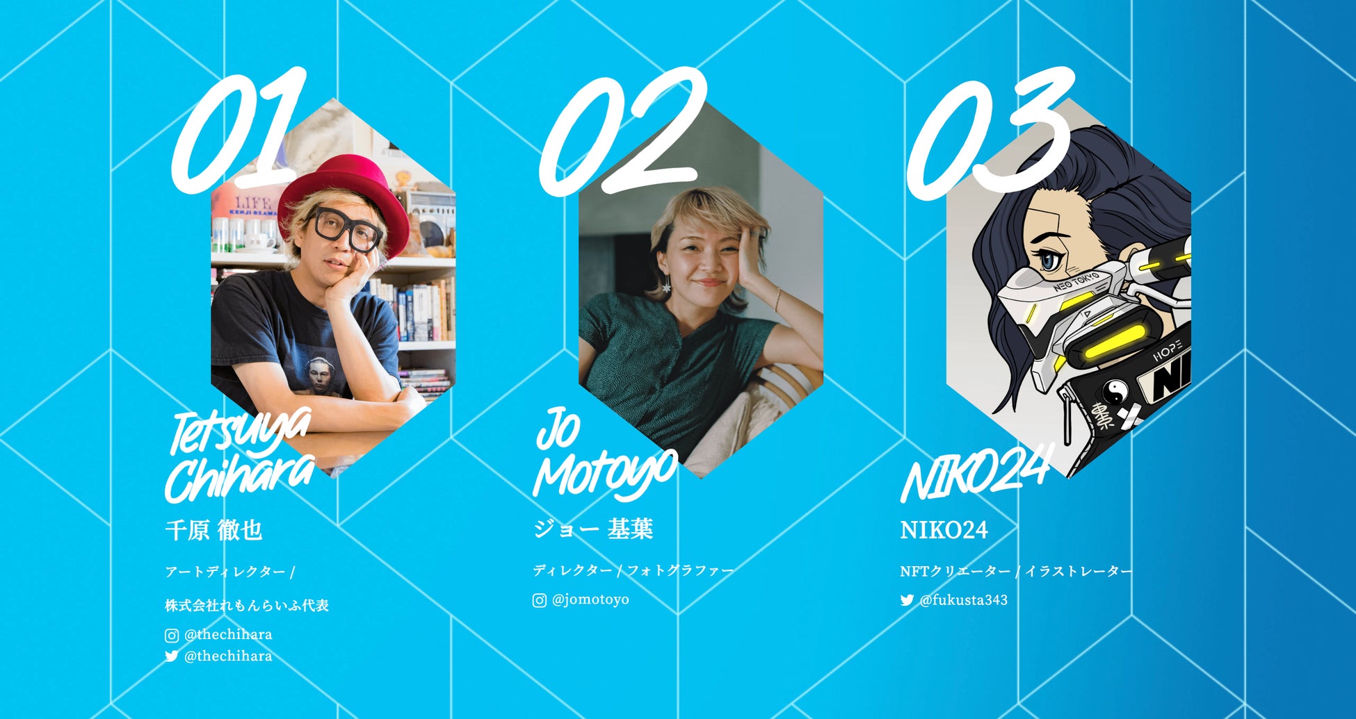 1985年福岡県生まれ。2021年9月にNFTクリエーターとして活動を始める。2022年3月にリリースした「サイバーパンク」をテーマにしたジェネラティブNFTコレクション『NEO TOKYO PUNKS』は2222枚のNFTが2分で完売。opensea(NFT取引所)24H取引高ランキングでは、当時国内初となる27位にランクイン。2022年10月現在の総取引高は3億円にのぼる。NFTという新しい技術から誕生したIPを世界に広めるために活動を行なっている。