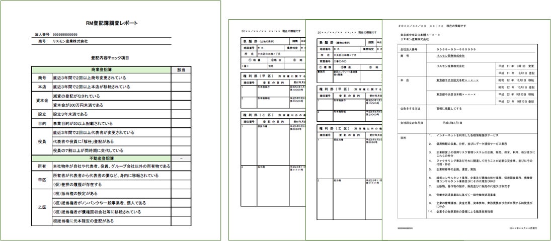「商業登記簿」や「不動産登記簿」等の登記情報をもとに、16の項目でリスク判定を行うレポートです。リスク判定の有無を示す「チェックシート」と、取得した「商業登記簿」「不動産登記簿」をまとめてご提供します。