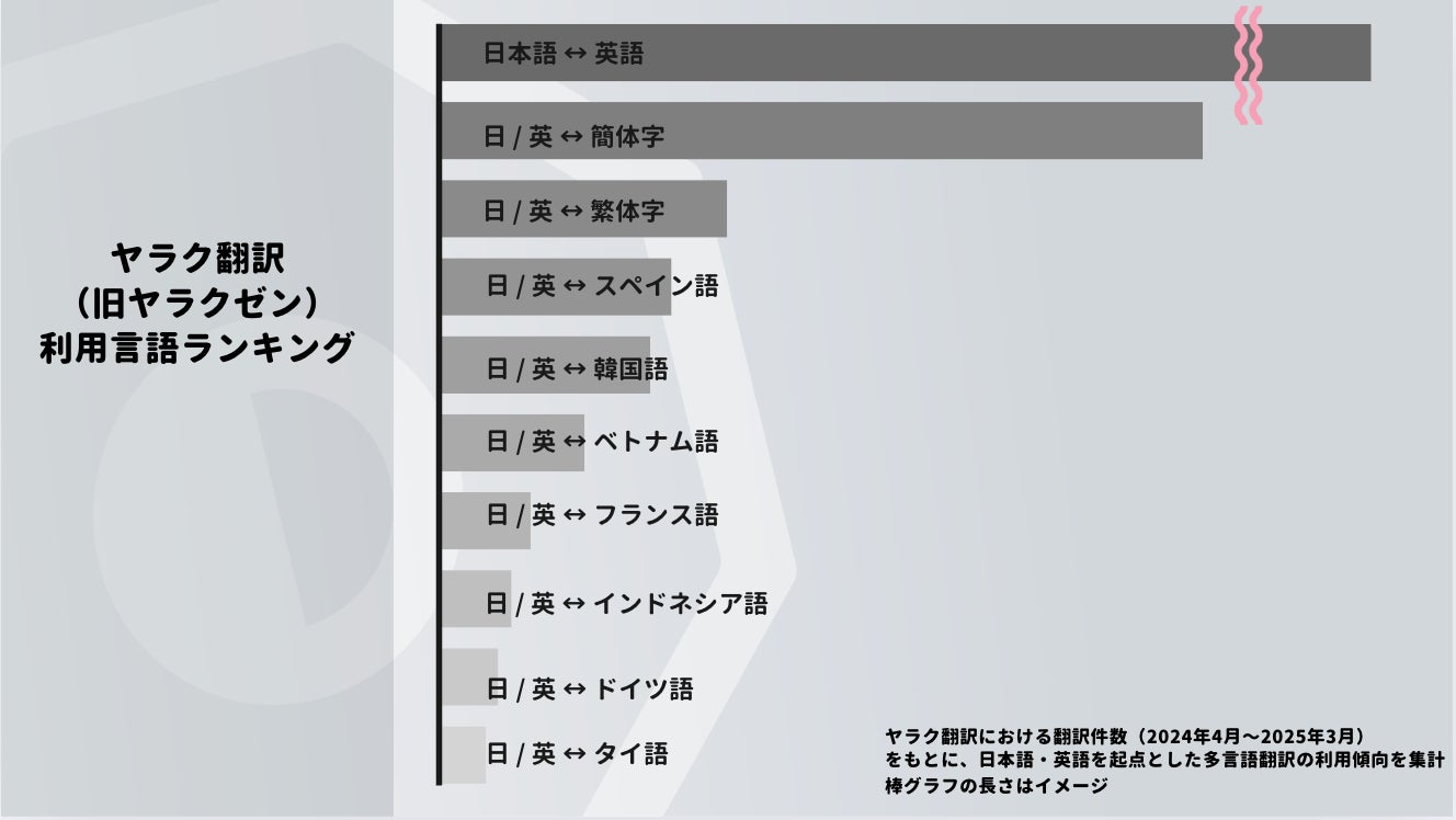 生成AIを搭載した翻訳支援ツール(CATツール*)「ヤラク翻訳」を提供する八楽株式会社(本社:東京都渋谷区、代表取締役:坂西優、以下八楽)は、言語の多様性と平等を称える記念日である「国連言語デー(UN Language Days)」にあわせて、過去1年間におけるヤラク翻訳の言語利用傾向を公開しました。公開したデータでは、日本語と英語の双方向翻訳が全体の圧倒的多数を占める一方で、ベトナム語、インドネシア語、タイ語といった東南アジア言語がTOP10圏内にランクインし、日系企業の東南アジア言語の翻訳ニーズの高まりを示す結果と分析しています。