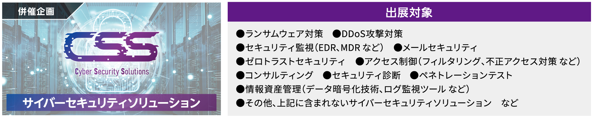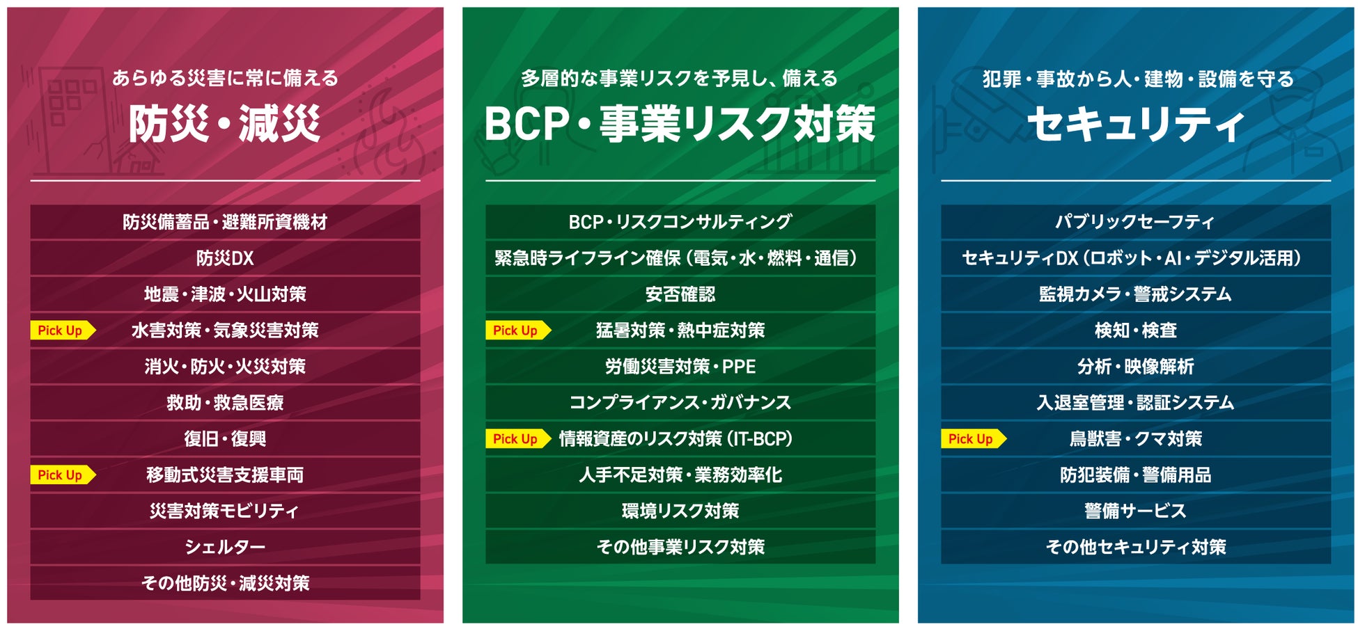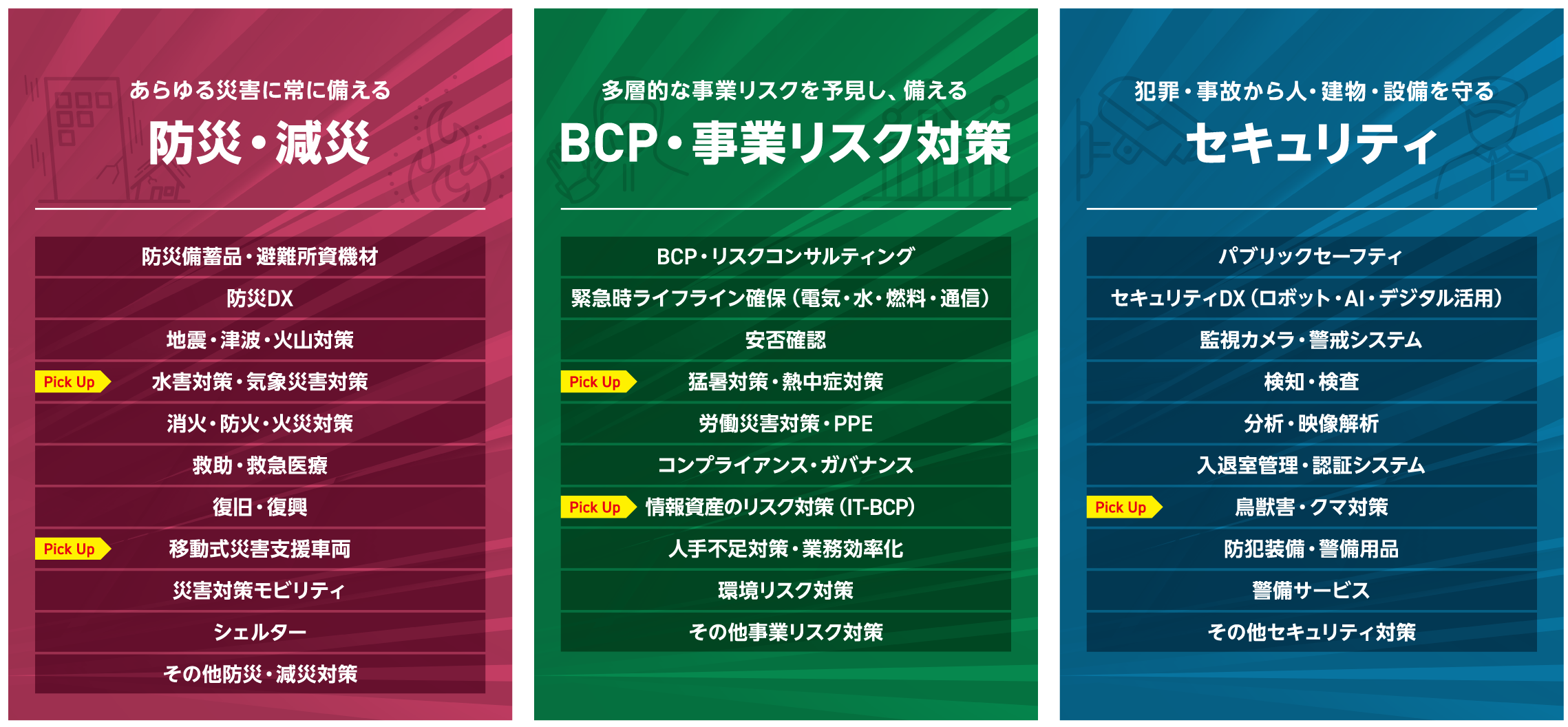本展の主要3分野である「防災・減災」「BCP・事業リスク対策」「セキュリティ」と、