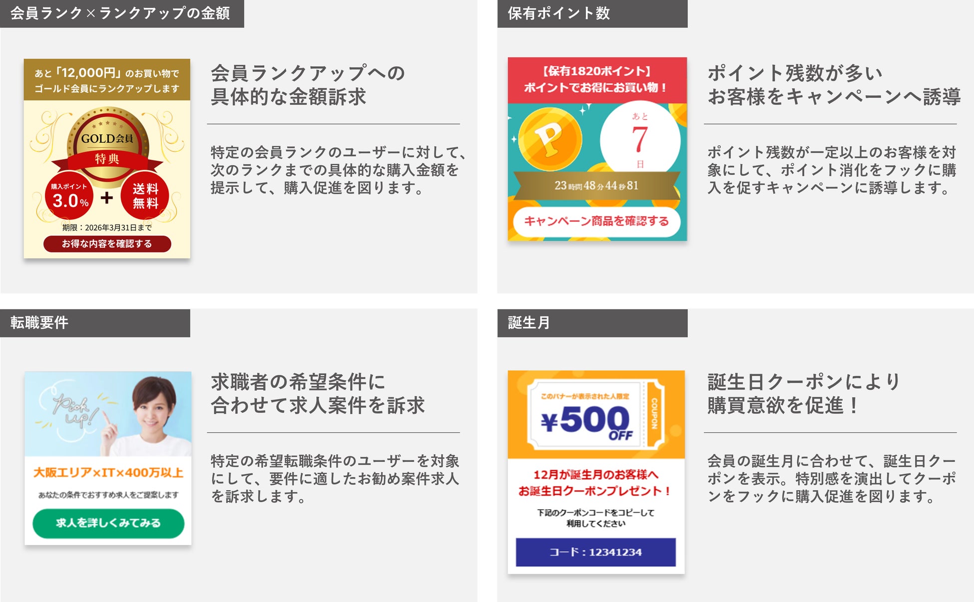 会員データ連携機能では、自社が保有する会員情報をTETORIと連携することで、ユーザーの属性や購入履歴、会員ランク、保有ポイントなどをもとに、より細かく正確なセグメント設定が可能になります。さらに「あと1,000円の購入で会員ランクがアップします」といった、会員情報に基づくパーソナライズ訴求も実現でき、コンバージョン率の向上に大きく貢献します。