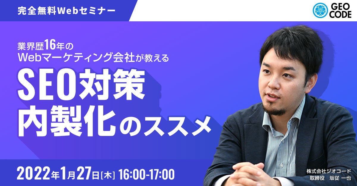 株式会社ジオコード(本社:東京都新宿区、代表取締役社長:原口 大輔、証券コード:7357)は、1月27日(木)にWebセミナー「SEO対策 内製化のススメ」を開催します。
