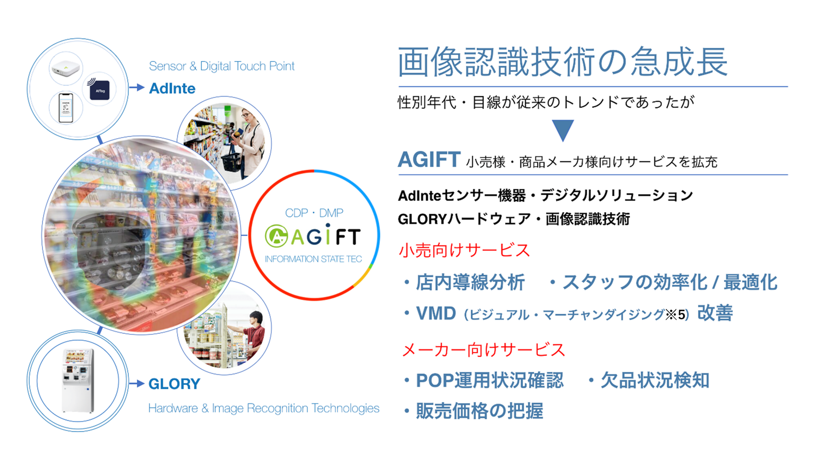IoTとAIを活用した流通小売・メーカーDX支援、リテールメディア開発・運用を行う、株式会社アドインテ(京都府京都市、代表取締役:十河慎治)は、グローリー株式会社(東証1部:6457 本社:兵庫県姫路市/代表取締役社長 三和元純、以下グローリー)より更なる連携強化を目的として追加出資を受け、両社出資による合弁会社、株式会社AGIFT(以下AGIFT)を設立したことをお知らせ致します。