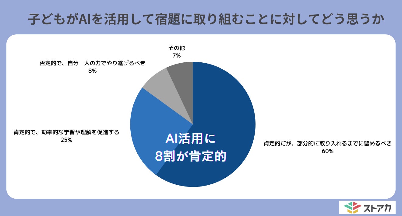 「子どもがAIを活用して宿題に取り組むことに対してどう思うか」を尋ねた結果、肯定的な意見が約8割をしめました。