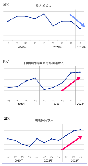 日系企業の日本本社における「海外駐在」前提の求人案件については原則ダウントレンドとなっています(図①参照)。