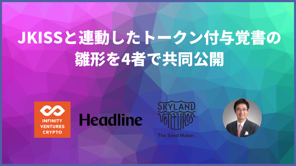Skyland Ventures(本社:東京都渋谷区、パートナー・CEO:木下慶彦、以下SV)は、Web3時代におけるトークン投資に際して、国内法人として設立されたスタートアップを主な対象とする『J-KISSと連動したトークン付与覚書』の雛形を・Infinity Ventures Crypto(IVC)、Headline Asia、Skyland Ventures、増島 雅和氏の4者にて共同で公開したことをお知らせします。