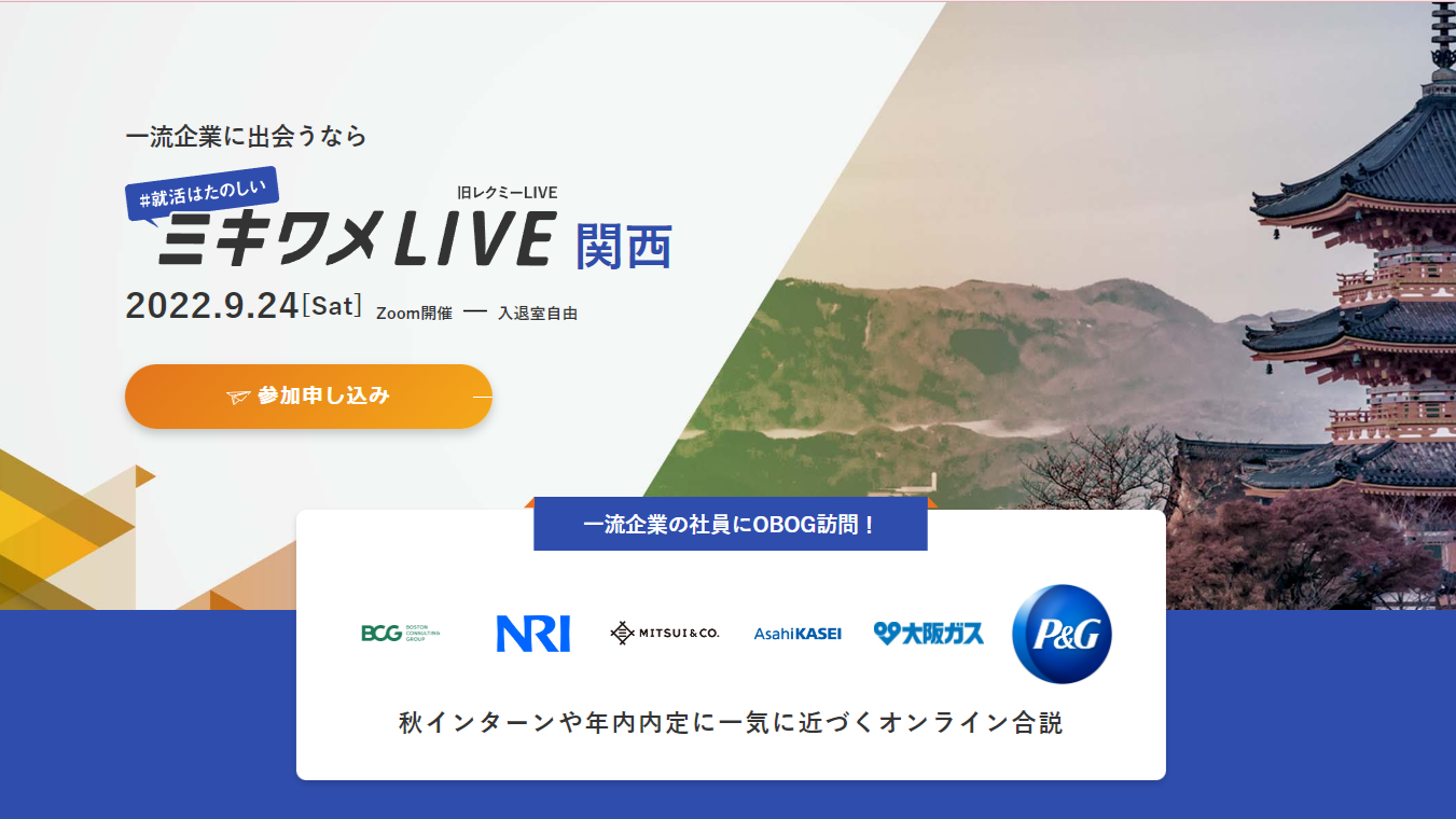 【9月23日(金)、24日(土)開催】商社/コンサル/メーカー/メガバンク/インフラ等、一日で人事に一気にOBOG訪問!就活サービス「ミキワメ」がミキワメLIVE 関東/関西を開催