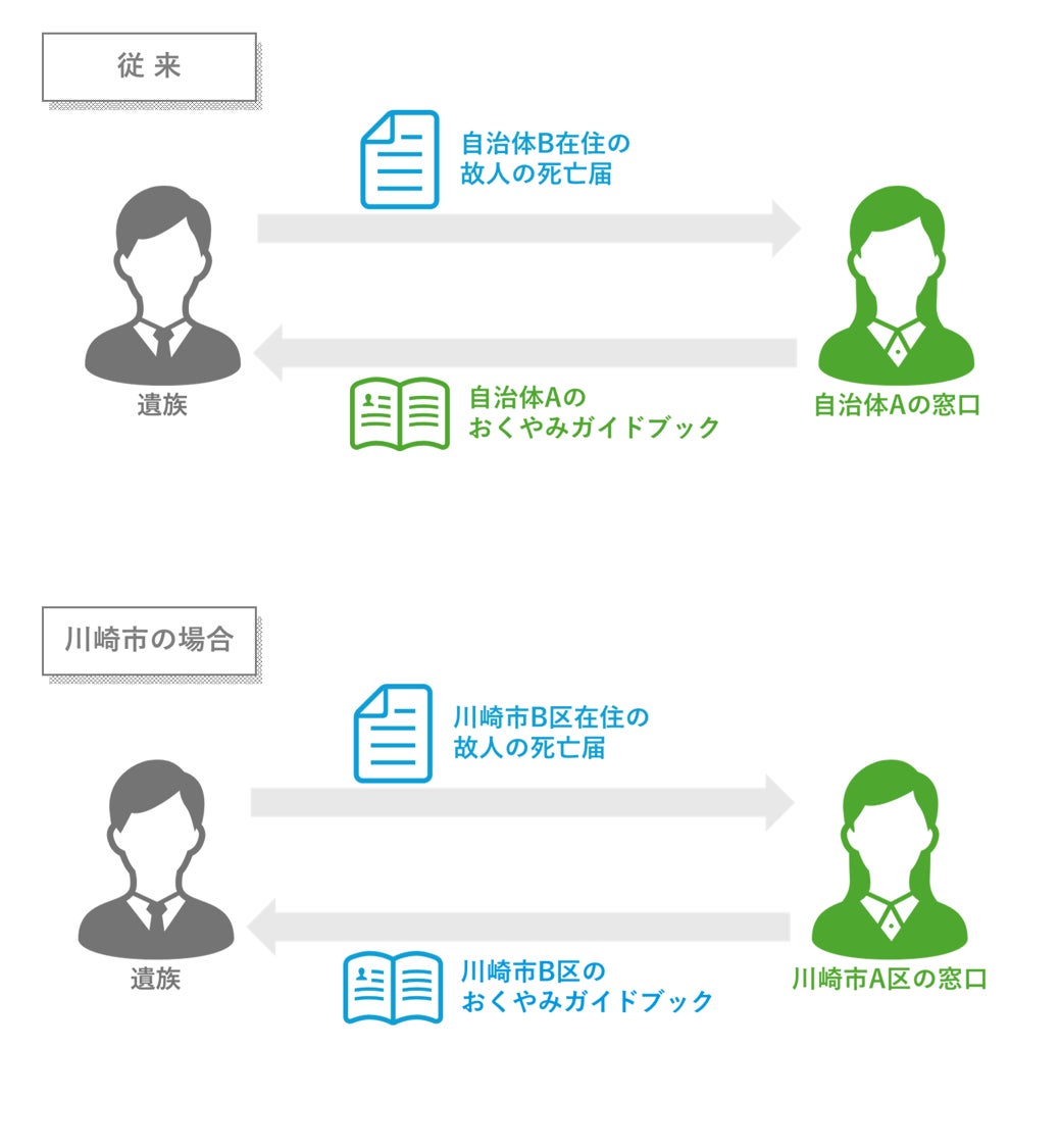 おくやみガイドブックは、死亡届を出した際に、提出先の自治体の冊子を受け取る流れとなっています。そのため、死亡届を故人の住所地以外の自治体で提出した場合、実際に手続きを進める自治体のおくやみガイドブックを受け取る機会がなく、遺族が故人の住所地の自治体まで取りに行かなければなりませんでした。そこで、今回の川崎市への納品にあたっては、市内であればどの区であってもいずれのガイドブックを受け取ることができるように配慮いたしました。