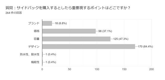 アンケートで、「サイドバックを購入する場合に重要視するポイント」について尋ねたところ、1位は「デザイン」で64%ものカブヌシが重視していることがわかりました。(次点は「容量」)