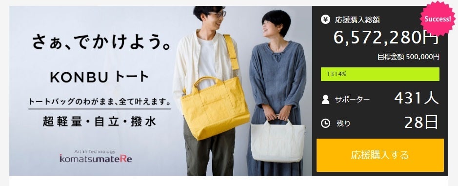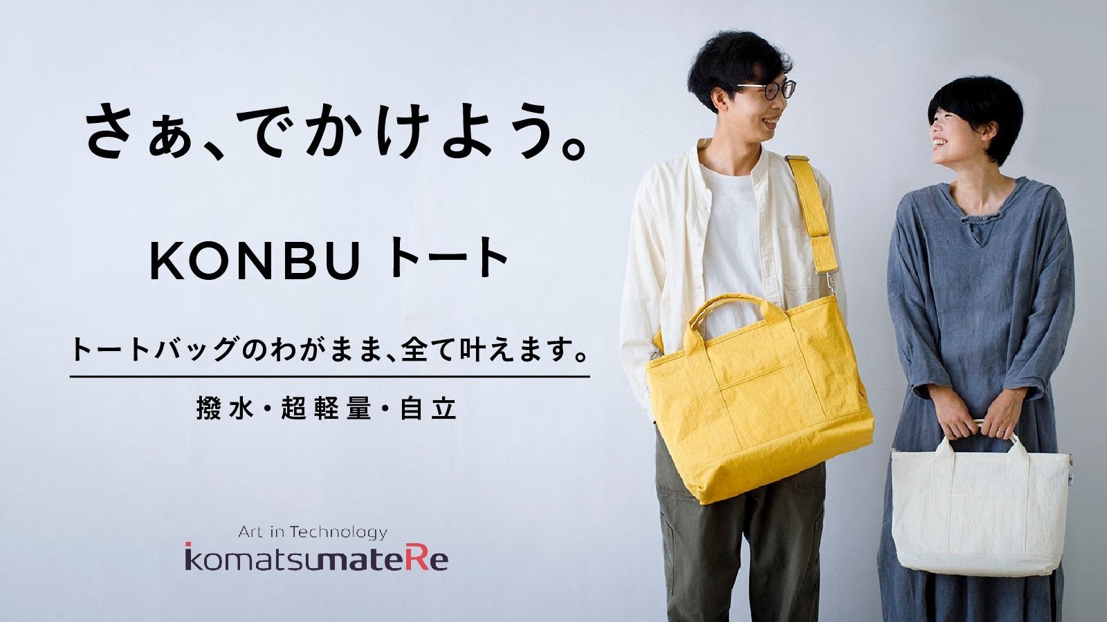 ⼩松マテーレ株式会社(本社:⽯川県能美市、代表:佐々⽊久衛)は、9月15日より、応援購⼊サービス「Makuake」にて特殊加⼯素材「KONBU®︎(コンブ)」を使ったトートバッグ「KONBUトート」を販売しました。この「KONBUトート」は、発売当初から多くの方々にご好評をいただき、発売初日のMakuakeランキングでは3位を獲得、プロジェクトスタート20日で目標額に対して1300%超えを達成しました。