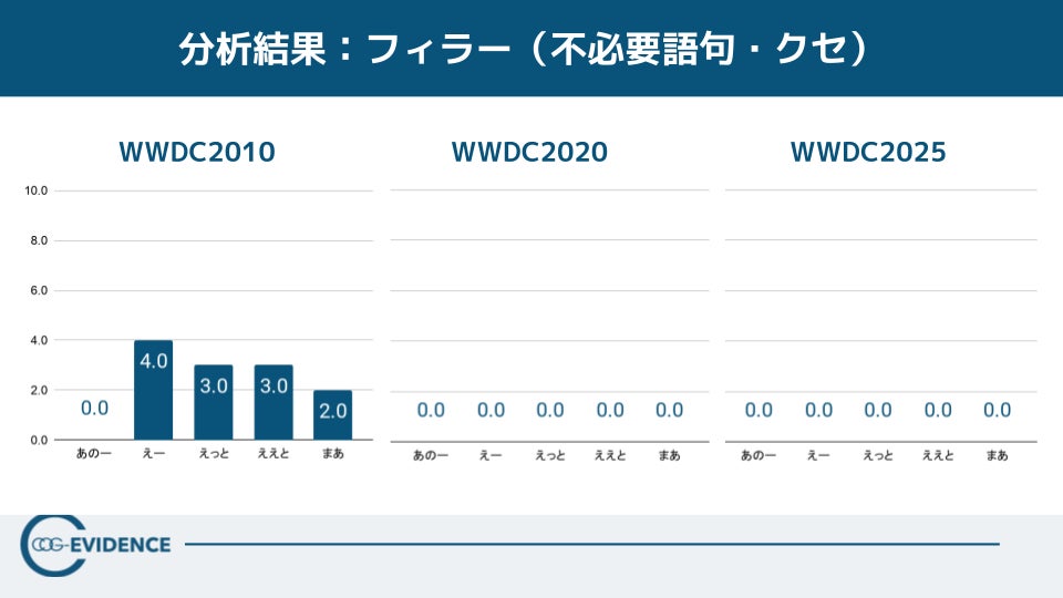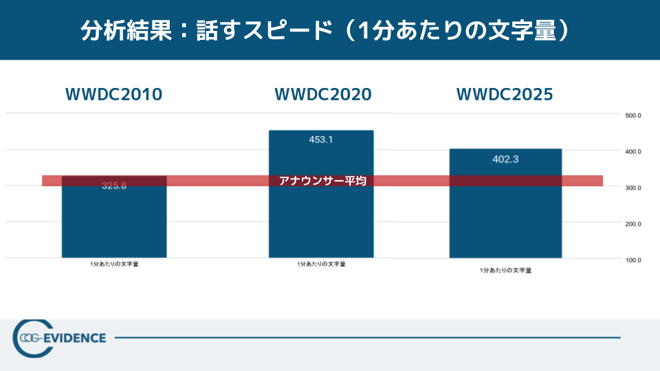 一方で、WWDC2025は情報量が多い回でもあります。話すスピードは402.3字/分と速いにもかかわらず、1000文字あたりの指示語は5.9回、フィラーは0という結果でした。つまり、情報量を増やしても冗長さや曖昧さを増やすのではなく、整理された主線の上で高密度に伝えるプレゼンとして設計されていることが示唆されます。