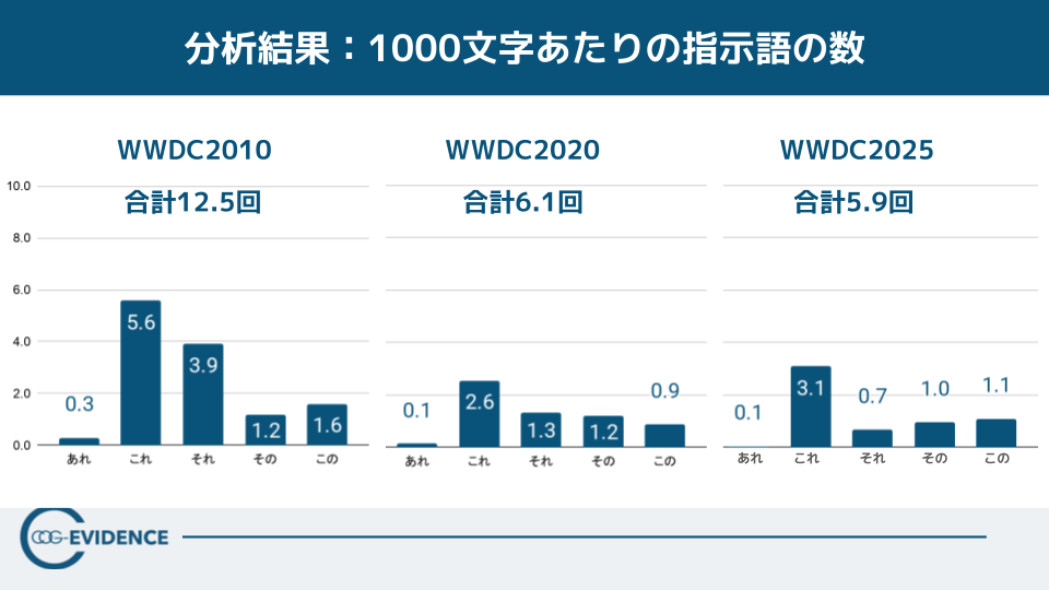 【読み取れること】WWDC2025は話すスピードが402.3字/分と速い一方で、指示語は1000文字あたり5.9回に抑制され、フィラーは0であった(参考:WWDC2010/2020側は1000文字あたり指示語合計9.3回)。