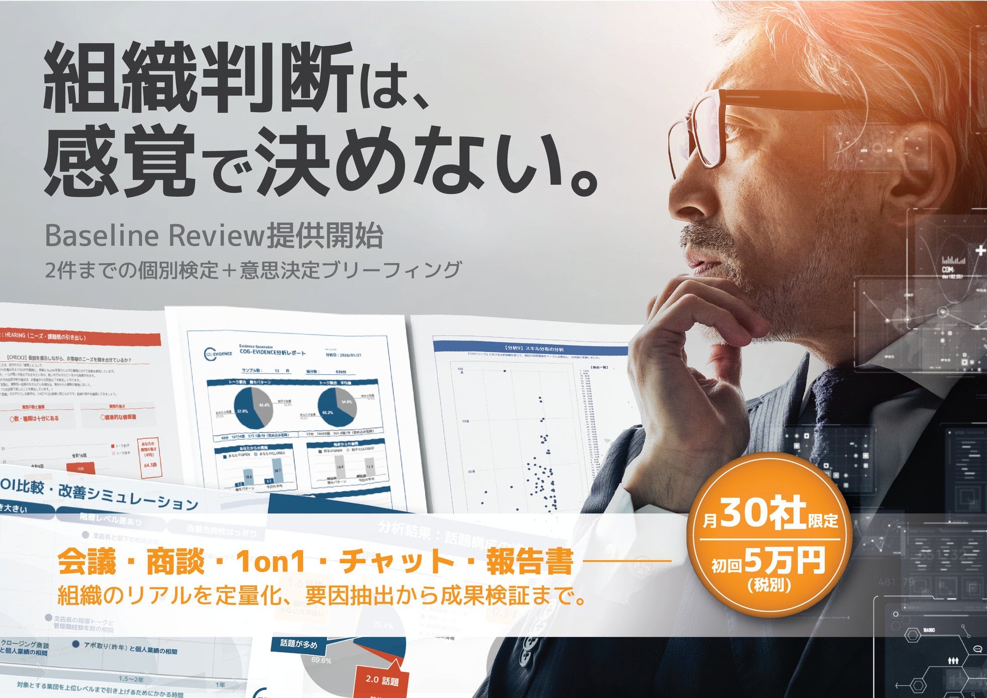 その入口として、短期間で現状の課題と改善の方向性を把握できる「Baseline Review(お試し)」を5万円(税別)で2026年1月27日にリリースいたしました。個人・組織の力量を確かめるため、パフォーマンスが良いトーク/悪いトークの違い(構成・論点の置き方・説得の流れ等)や最終版の再レビュー(Before/After比較)として、録画・音声・書類等を2本ご提出いただくことで、分析結果とブリーフィング1時間でフィードバックします。(個人利用の場合は、ブリーフィングに代わりメールもしくはオンラインセミナーにて実施)