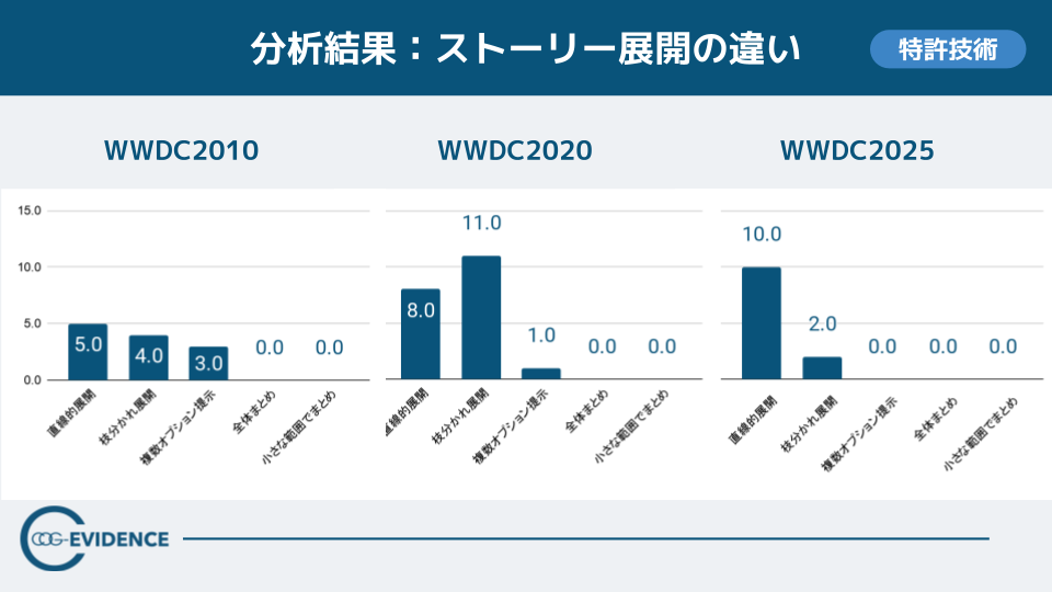 総合分析では、WWDC2025は「直接的展開 10.0/枝分かれ展開 2.0/複数オプション提示 0.0」となり、あえて枝分かれや選択肢比較を増やさず、主線の理解に必要な要素を順に並べる傾向が強いことが分かりました。情報量が増える局面ほど、論点を増やすよりも“主線の固定”が効く——WWDC2025は、その設計が構造として表れた回と整理できます。この直接的展開は“主線に沿って説明が進む度合い”、枝分かれ展開は“論点が横に分岐する度合い”を表します。