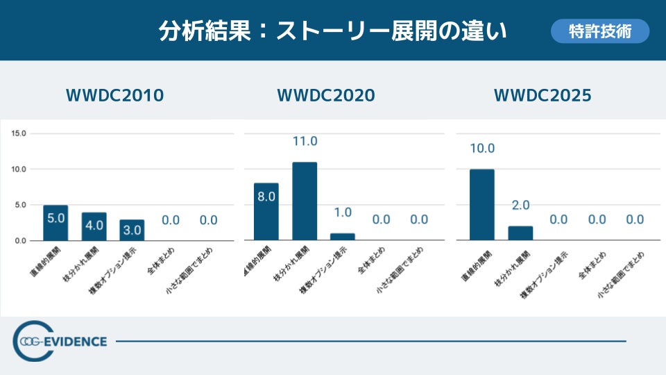 【読み取れること】WWDC2025は「直接的展開 10.0/枝分かれ展開 2.0/複数オプション提示 0.0」と、横に論点を拡散させず、主線で重要要素を順に積み上げる傾向が強い。