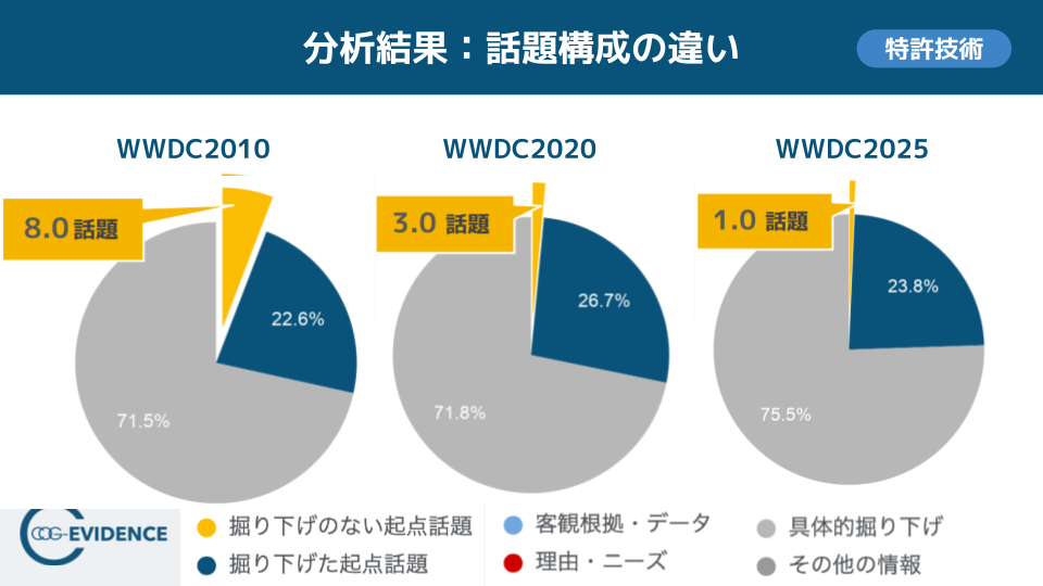 WWDC2025は話題数36件のうち、説明のある話題が35件、説明の少ない話題は1件にとどまりました。つまり、主線に沿って要素を積み上げるだけでなく、提示した重要要素を“置き去りにせず回収する”往復が設計されていることが分かります。これにより、高密度であっても「理解が追いつかない」副作用を抑えている点が、WWDC2025の構造上の特徴です。