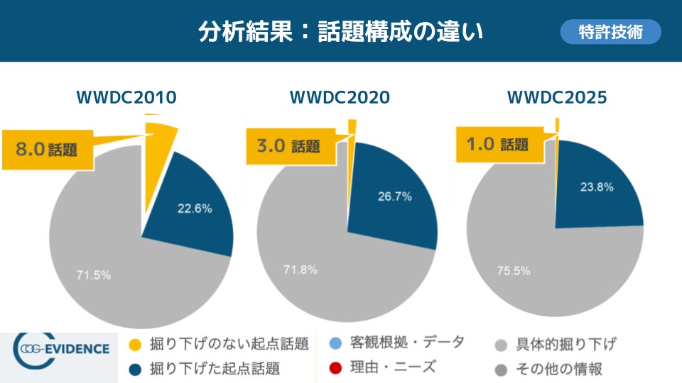 知識表現AIを用い、会話・文章情報から組織課題を可視化するコグニティ株式会社(本社:東京都品川区、代表取締役:河野理愛、以下「コグニティ」)は、Appleの開発者会議 WWDC(Worldwide Developers Conference)における WWDC2025 Keynote を対象に、発話の構造を定量化して分析したレポートのサマリーを公開しました。