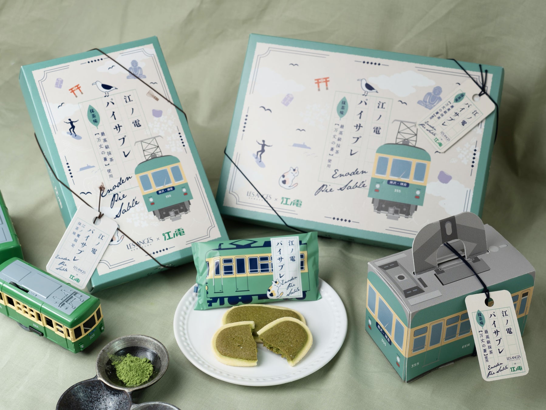 江ノ電パイサブレは、江ノ電カラーをイメージした抹茶サブレです。パッケージには、美しい江ノ電車両や鎌倉の風景をイメージしたモチーフをデザインし、特に商品タイトルのあしらいでは鎌倉が文学の街であることを表現しています。