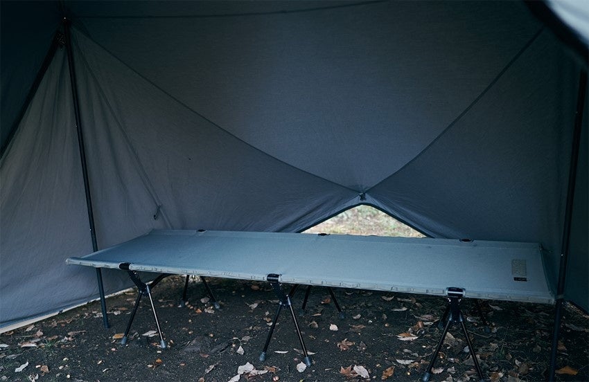 ”ダイヤモンド張り”を思わせるフォルムとグレーカラーが織りなすシャープで洗練されたデザイン。「視界が広く開放的なリビング」と「過不足のない寝室」を効率よくレイアウトし、ミニマムでありながら快適な空間を実現したテント、『ダイヤフォートTC』。