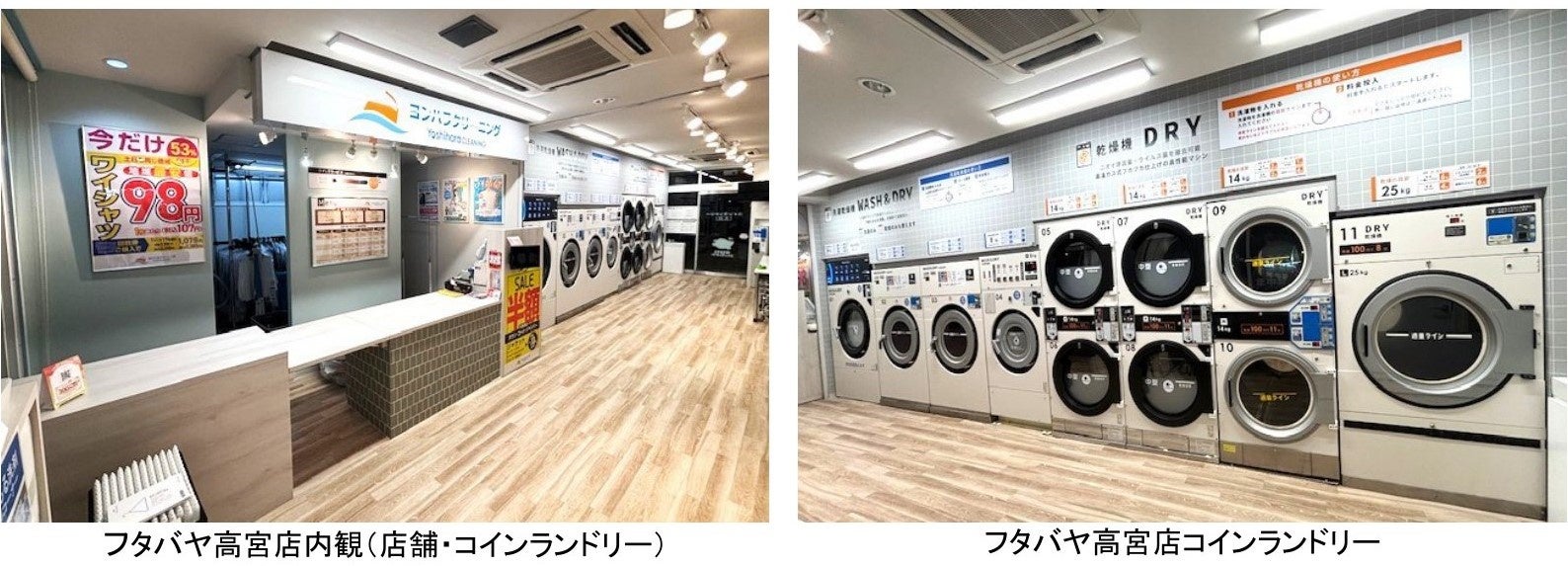以前よりこちらの敷地内で、クリーニングの預り所を営業しておりました。また、その店舗に併設してフタバヤ店がコインランドリーを営業されておりました。今般、お客様により快適にご利用いただけるように、店舗とコインランドリー共にリニューアルして、コインランドリーも弊社が営業する運びとなりました。