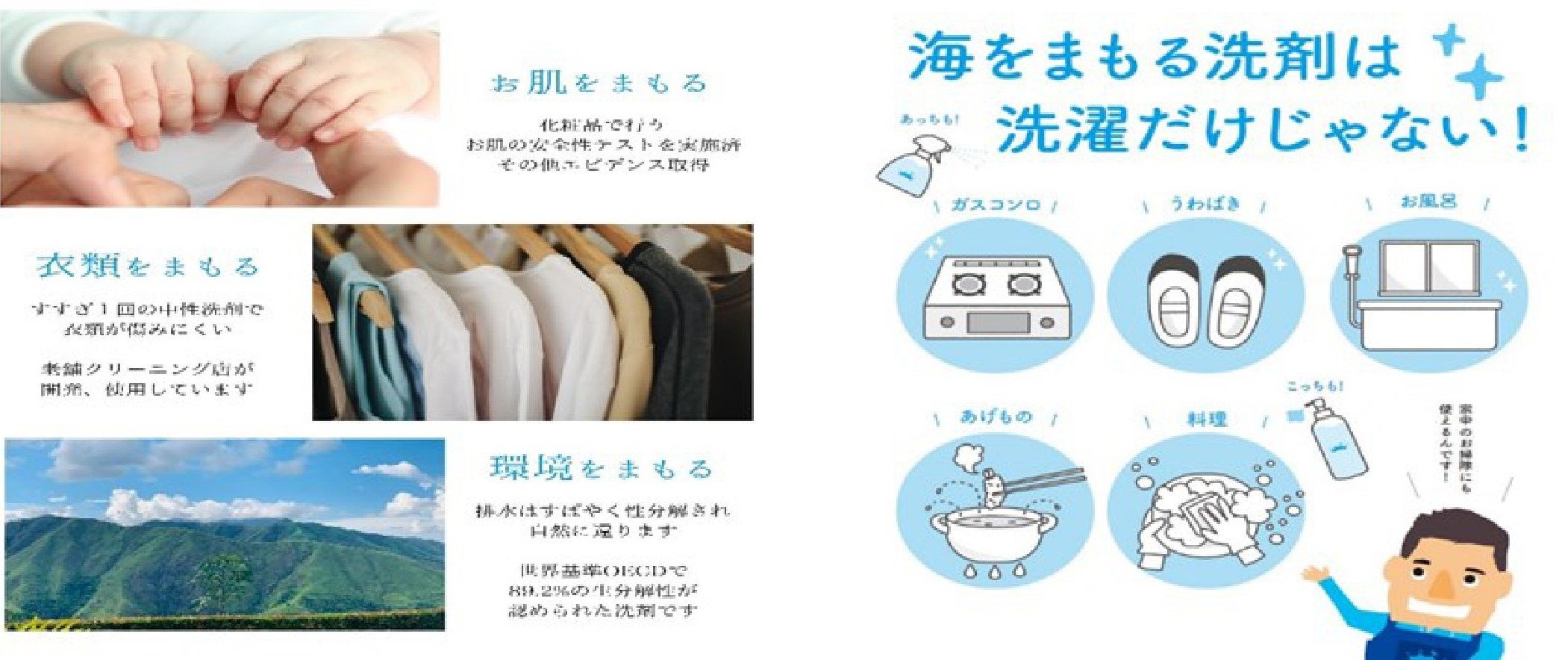 『海をまもる洗剤』は、世界基準(OECD)で、89.2%の生分解性が認められることから、排水は自然に還ります。衣類や靴の洗濯だけでなく、キッチンの汚れなど掃除にも利用できることから、1種類の洗剤ですみ、ボトルは再利用できるのでプラごみ削減につながります。