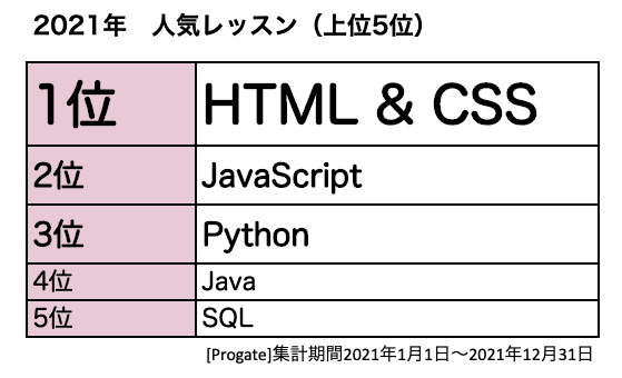 - 2021年の人気レッスン1位は「HTML&CSS」、2位「JavaScript」、3位「Python」、3位までの順位は去年と変わらない結果に