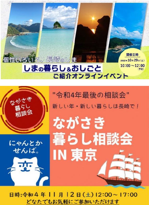 長崎県(本庁:長崎県長崎市、知事:大石賢吾)は、長崎県への移住を希望する方を対象に、令和4(2022)年10月29日(土)に「しまの暮らし&おしごとご紹介オンラインイベント」を、11月12日(土)に「ながさき暮らし相談会 IN 東京」を開催します。