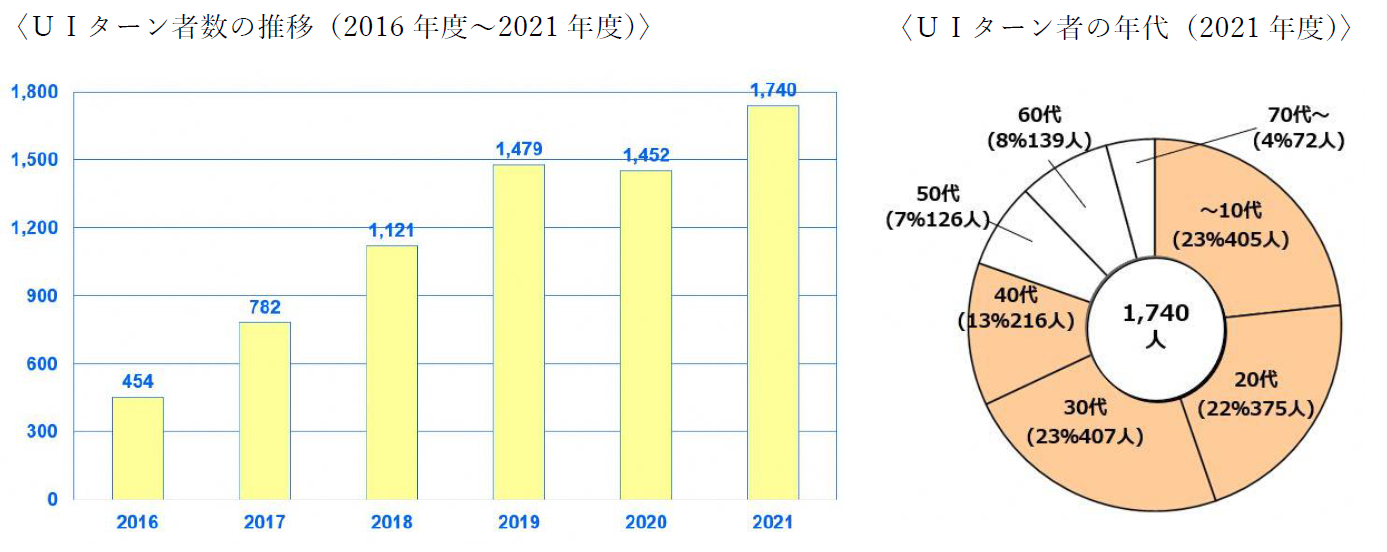 長崎県へ移住される方は増加傾向にあり、令和3(2021)年度は1,740名の方が県外から移住し、5年前の平成28(2016)年度と比較して4倍近くに増加しました。移住後のアンケート結果からは、長崎県の恵まれた自然環境の中での暮らしに対する関心が高い一方で、子育て環境や教育環境、地方での落ち着いた暮らしの環境を求めて検討を進め、都市部からの移住先として長崎県を選択されている方が多いことが窺えます。近年、40代以下の若い世代が全体の約8割を占めていることからも、これからの子育て世代に長崎県が選ばれていることが分かります。長崎県では、引き続き県と市町が連携して移住施策に取り組んでまいります。