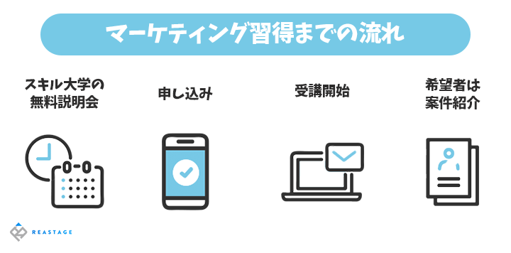 リアステージで実際に実行し成果を出したノウハウをもとに構築したカリキュラムとなっております。現在、マーケティング講座のリリースは完了しており、今後さらなる講座のリリースを進めていきます。