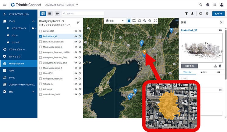 Trimble Business Centerからデータをアップロードすると、Map上に計測地点を自動で表示し、さらにMapを拡大すると取得した点群の領域を視覚的に確認することができるため、複数の計測地点を効率的かつ容易に管理することが可能です。