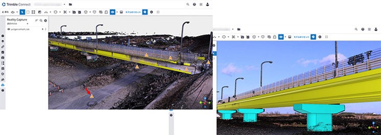 さらに、当社製品の地上型レーザースキャナー「Trimble SXおよびXシリーズ」で計測したデータの場合、スキャン測点ごとに撮影した写真をつなぎ合わせたパノラマ画像として点群データと同時に表示できるため、オフィスにいる関係者でも現場を調査・確認することが可能です。