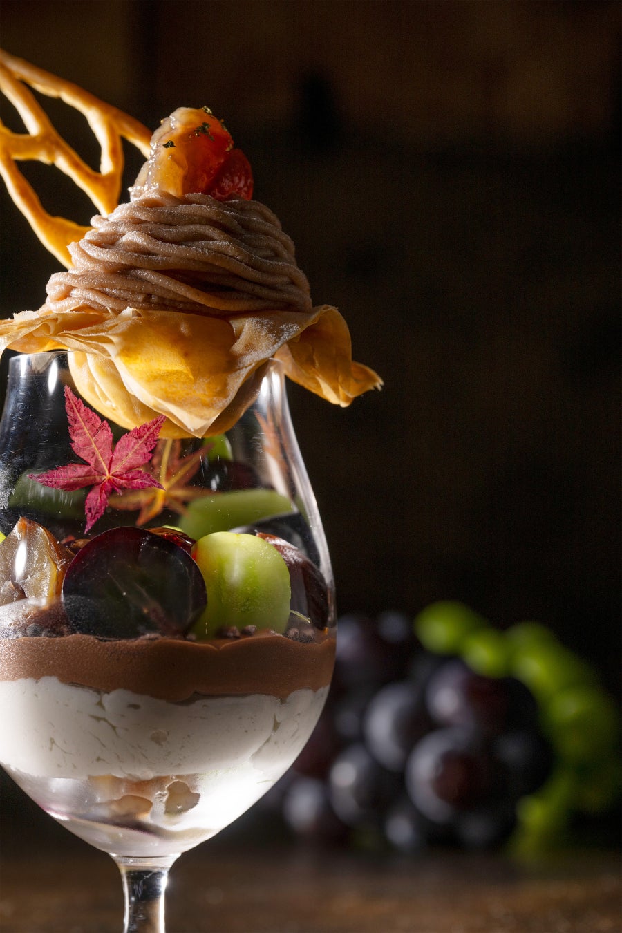 グラスにのったパリパリとした食感のパートフィロの上に香り高いぶどうのジュレとミルクアイスクリームを重ね、さらに上品な甘みのマロンクリームをたっぷりと絞って、トップにはマロングラッセをトッピング。