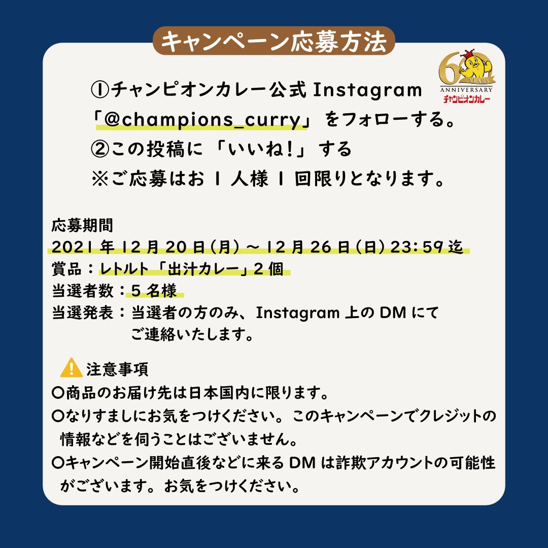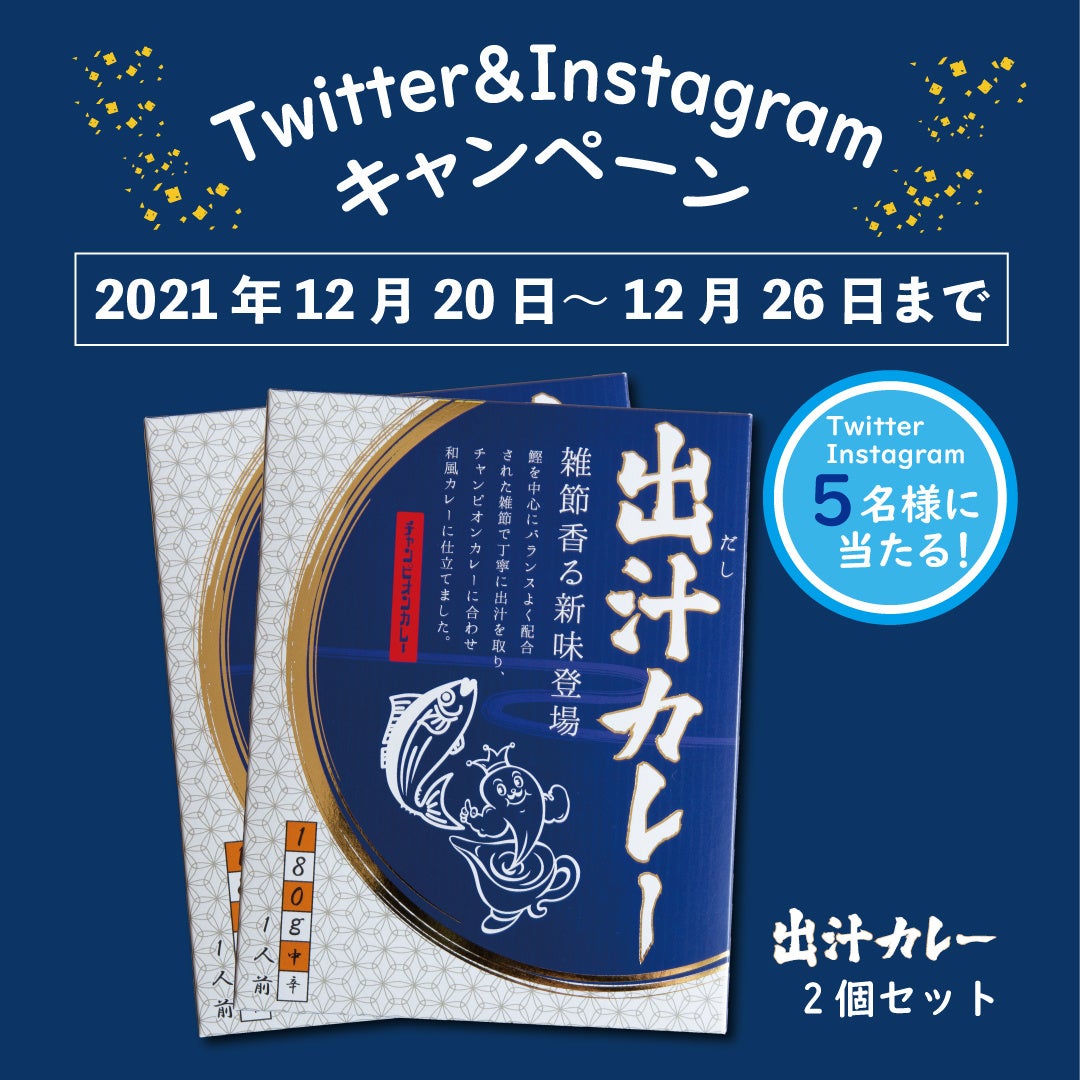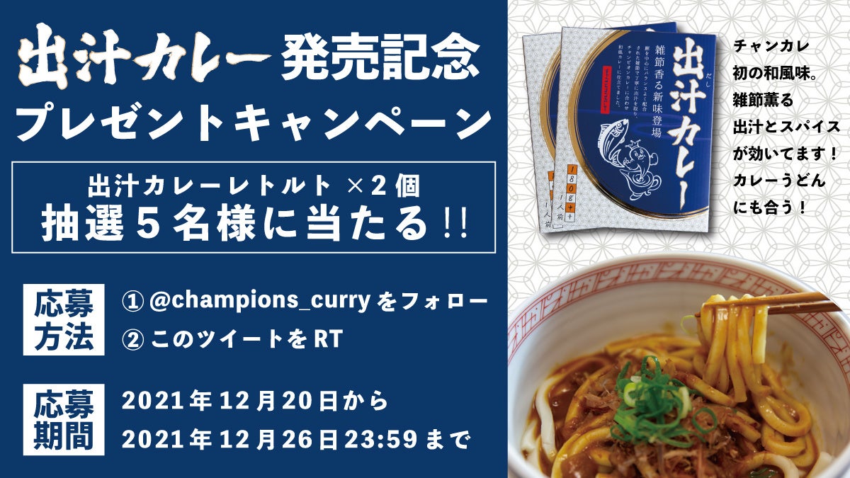 株式会社チャンピオンカレー(本社:石川県野々市市、代表取締役:南 恵太)では、2021年11月25日にチャンピオンカレー初となる和風味「出汁カレー」レトルトカレーを販売しております。この度、発売を記念し2021年12月20日(月)~2021年12月26日(日)までの期間中、TwitterとInstagramを利用したキャンペーンを行います。