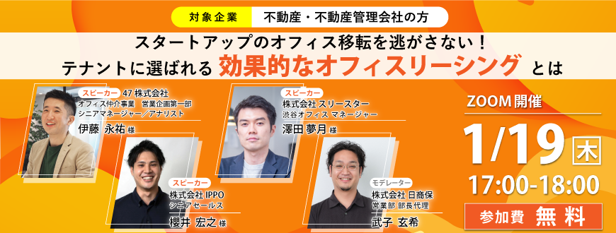 今回、「スタートアップのオフィス移転を逃がさない!テナントに選ばれる効果的なオフィスリーシングとは」をテーマに、スタートアップ企業のオフィス移転仲介に豊富な実績を持つ47株式会社、株式会社IPPO、株式会社スリースターといった仲介会社の方々をスピーカーに迎え、オンラインセミナーを開催いたします。