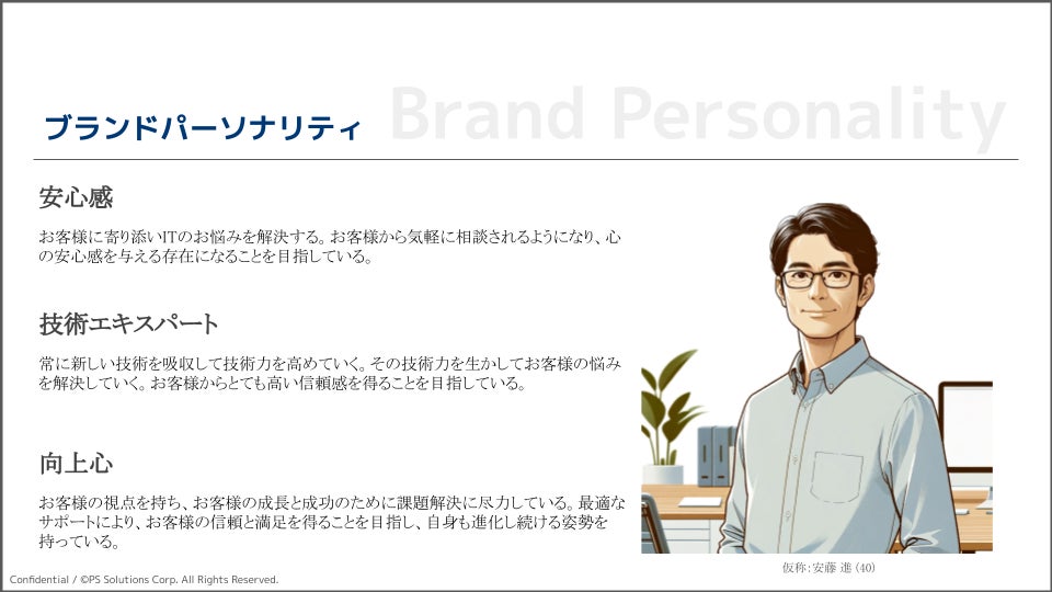 PSソリューションズのブランドパーソナリティとして、「安心感」、「技術エキスパート」、「向上心」を軸にお客様へサービス提供いたします。技術エキスパートとしてお客様に寄り添いITのお悩みを解決し、お客様からとても高い信頼感を得ることを目指しております。また、常にお客様の視点を持ち、お客様の成長と成功のために課題解決に尽力していきます。