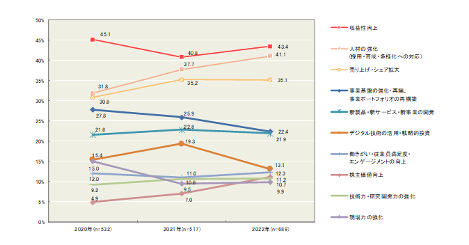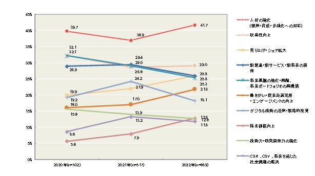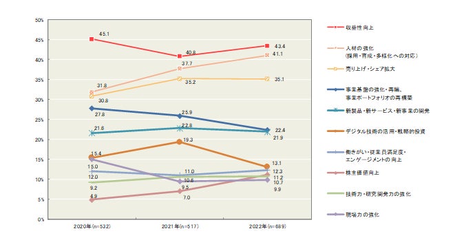 『日本企業の経営課題2022』 調査結果速報【第5弾】現在当面している経営課題は「収益性向上」が最多。「3年後」の課題は「人材の強化」が最多、昨年よりも重視度が高まる