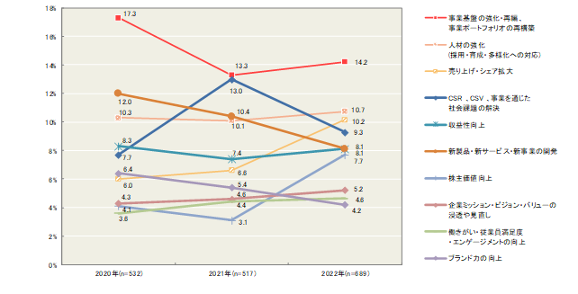 ○ 昨年からの変化としては、「CSR、CSV、事業を通じた社会課題の解決」が3.7ポイント減少し、「売り上げ・シェア拡大」(+3.6ポイント)「株主価値向上」(+4.6ポイント)が増加しています。