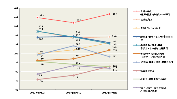○ 過去3年間の推移を見ると、トップ3の項目は昨年、一昨年と変化はありません。ただし、第1位の「収益性向上」(+2.6ポイント)、第2位の「人材の強化」(+3.4ポイント)は昨年よりも比率が上昇しました。