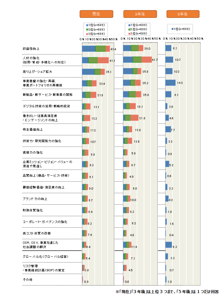 - 1.企業が「現在」当面している経営課題は「収益性向上」が最多 「3年後」は「人材の強化」、「5年後」は「事業基盤の強化・再編、事業ポートフォリオの再構築」が最も高い