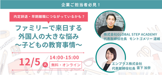 Join us on December 5th for an insightful webinar designed specifically for companies engaging foreign employees. The webinar will shed light on crucial aspects of children's education in Japan, addressing foreign employees' concerns that often influence their decisions regarding job offers or premature job terminations