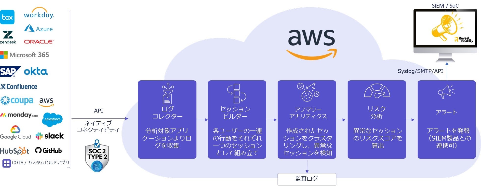 RevealSecurity社の顧客には、金融機関、テクノロジー企業、製造業などが含まれており、Salesforce.com, AWS, ServiceNow, GWS, OKTA, Dynamics, MS365, Box, SAP, Workday を中心としたSaaSアプリケーションをモニタリングしています。