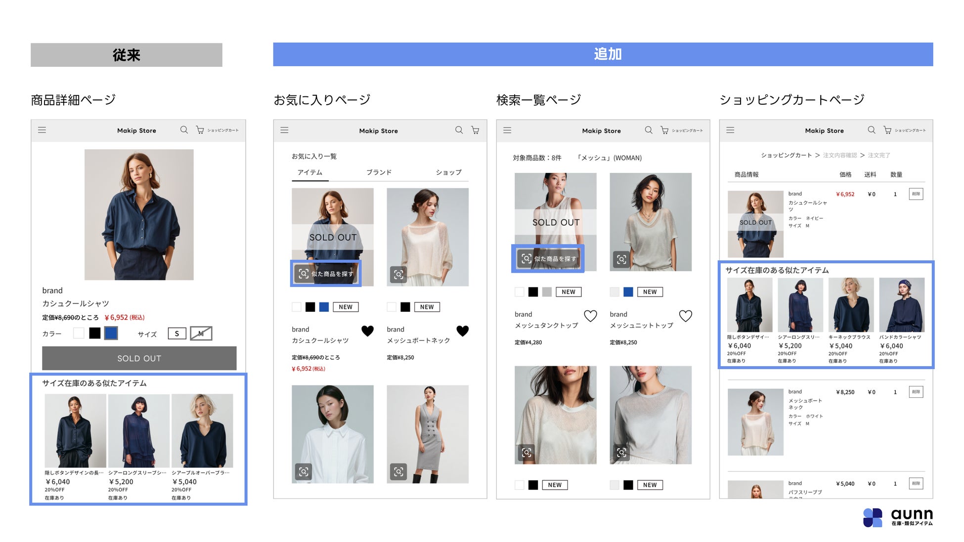 株式会社メイキップ(東京都新宿区、代表取締役:柄本 真吾、以下「メイキップ」)は、「aunn 在庫・類似アイテム」において、従来の商品詳細ページに加え、お気に入りページやショッピングカートページなどで、最適な代替商品を提示できるよう表示先を拡大しました。これにより、欠品によるユーザーの離脱を防ぎ、より快適な購買体験と新たな販売機会の創出を実現します。