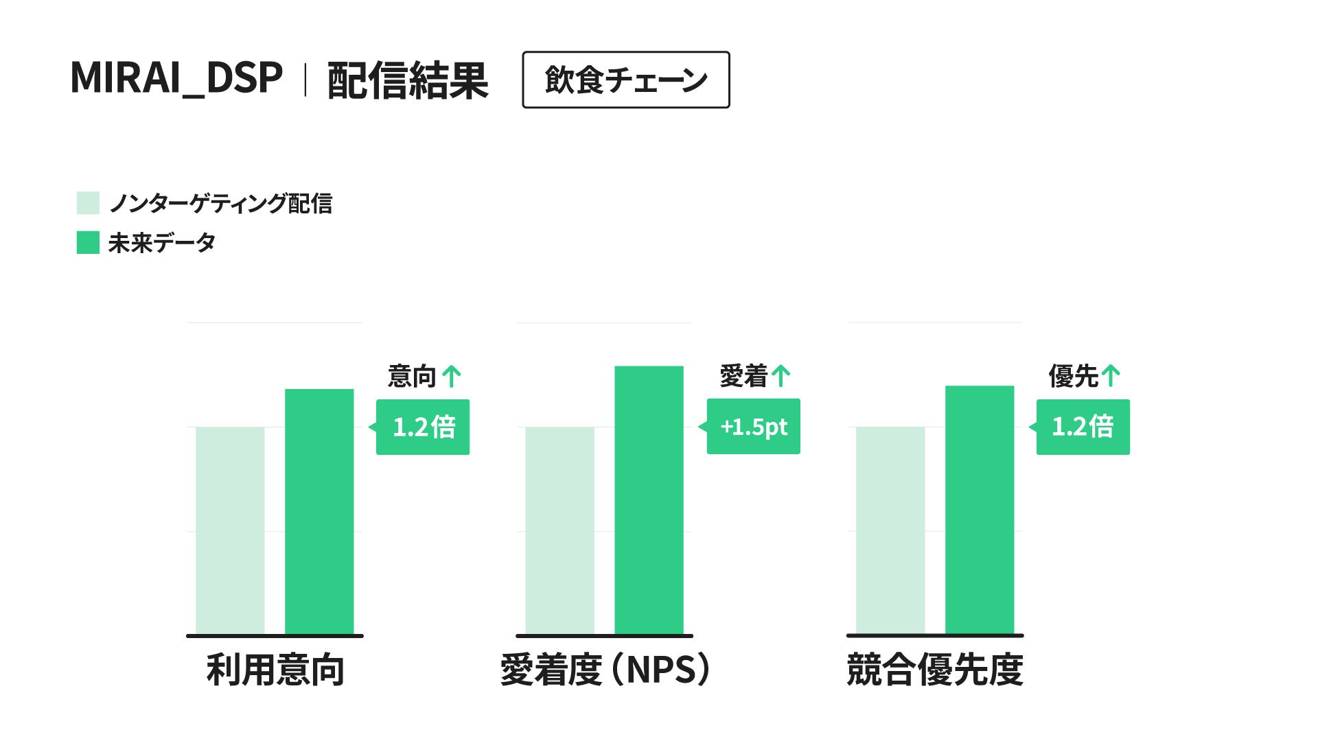 ノンターゲティング配信と比べ、利用意向や競合優先度が1.2倍。NPSで測定した愛着度は1.5ポイント向上。