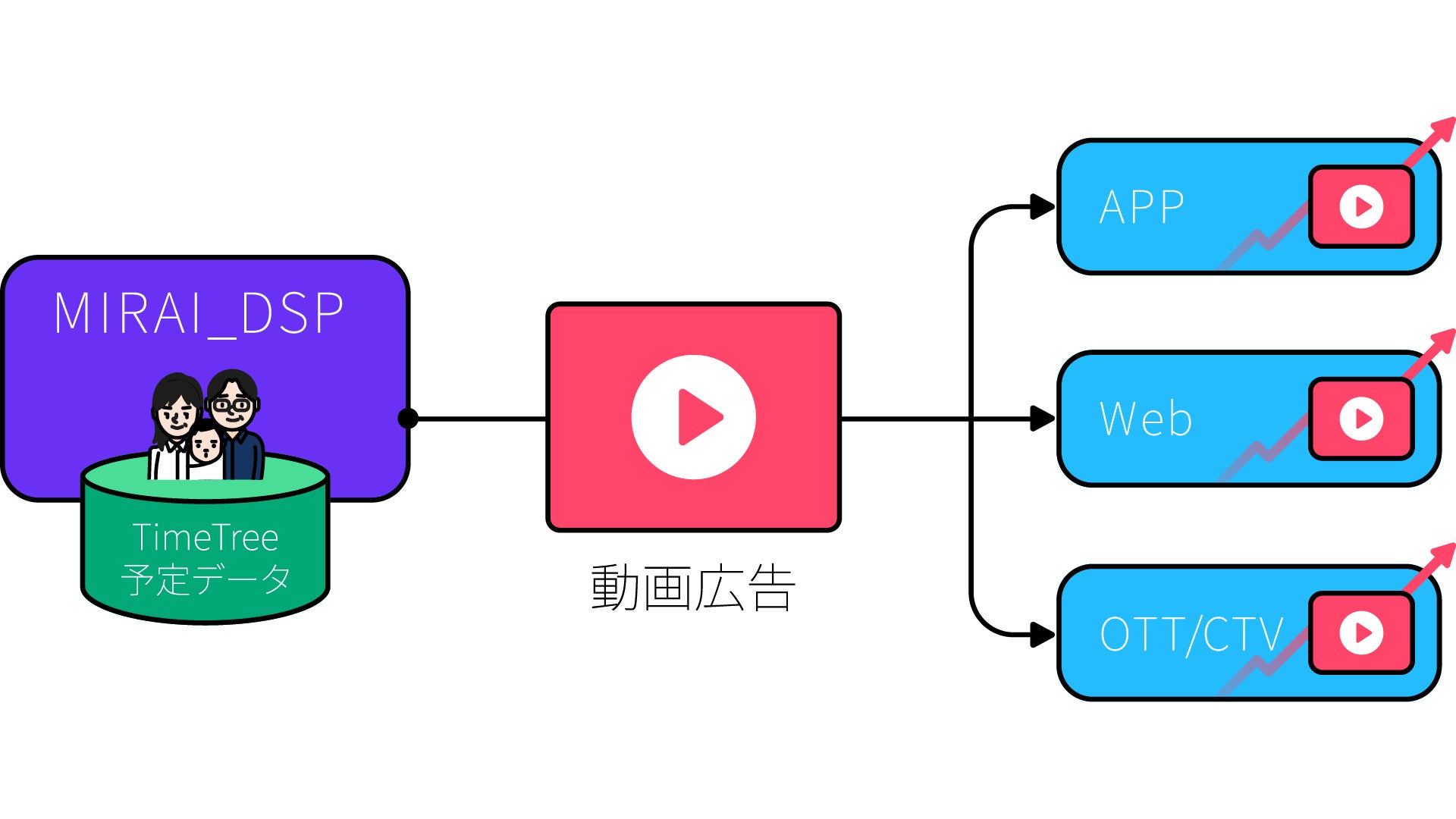 TimeTreeとDACが共同開発した広告配信システム。ユーザーの行動や購買を予測するアルゴリズムを元に生成したセグメントでの配信により、生活者に寄り添ったターゲティングを実現します。アルゴリズムでは、過去の実績データだけでなく、TimeTreeユーザーがカレンダーに登録している予定やライフイベントなどの「未来データ」を活用し、特定の日時や購入・サービス利用タイミングなど具体的なユーザーの未来の行動を予測。ユーザーは予定に関連する有益な情報を最適なタイミングで得ることができ、広告主は確度の高い見込み顧客にアプローチする効率的なマーケティングが可能なことから、双方がメリットを享受できる新しいシステムです。