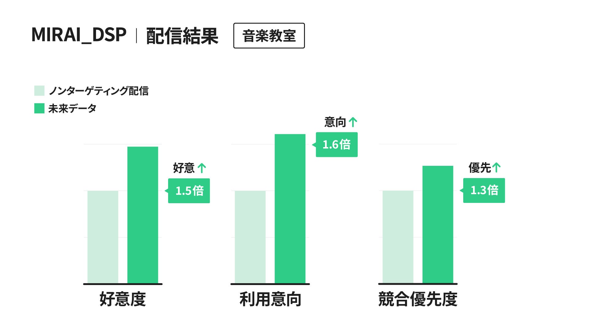 音楽教室: 好意度が1.5倍、利用意向が1.6倍、競合優先度が1.3倍飲食チェーン: 利用意向、競合優先度が1.2倍。