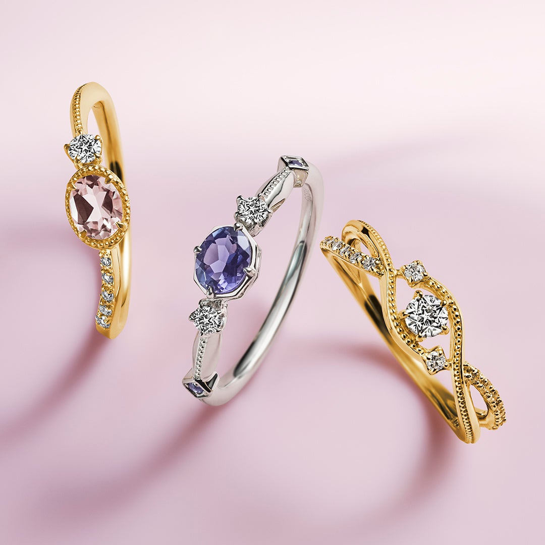 透き通るすみれ色のような青色をもつ3月の新誕生石アイオライト。柔らかな美しいピンク色をもつ4月の新誕生石モルガナイト。それぞれのカラーストーンを優しく包み込む曲線的フォルム、添えられたダイヤモンドが一層華やかに引き立てます。お手持ちのジュエリーに組み合わせ、あなただけのコーディネートをお楽しみいただけます。